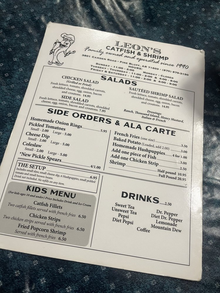 Welcome to Leon’s Catfish & Shrimp Restaurant, a hidden gem nestled in Pine Bluff, AR, where seafood lovers unite! This casual diner is famous for its friendly atmosphere and communal vibe, making it feel like home. The menu shines with crispy fried catfish and succulent shrimp, served with perfectly seasoned sides like hushpuppies and cole slaw that elevates the dining experience.